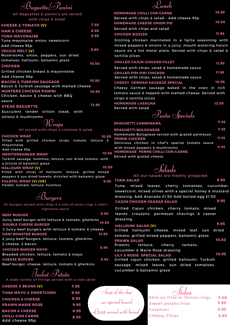 Baguette and Panini selections feature a range from simple Cheese & Tomato or Ham & Cheese to more substantial items like Hunters Chicken Panini and Steak Baguette.